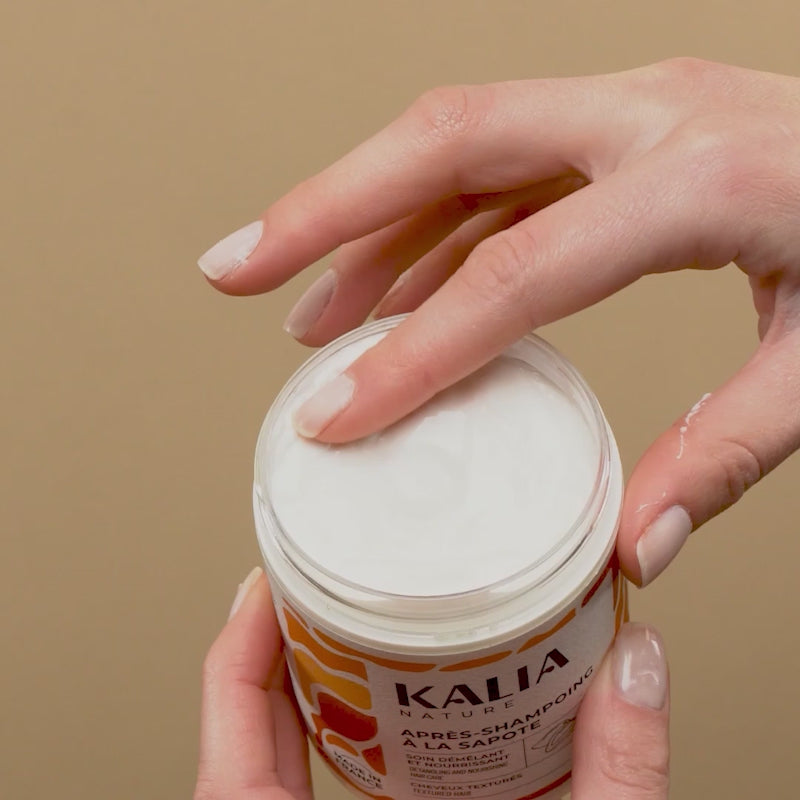 L’Après-Shampoing à la Sapote de Kalia Nature nourrit, régénère et renforce la fibre capillaire.
